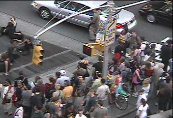 For this performance, the SCP consisted of Gus, Bill, Kristin and Kimberly, and was supplemented by Scott, who filmed it on a Super 8 camera, and Michele (present at the group's very first performance), who gave out flyers the SCP specially designed for the performance. Also in attendance were a duo (freelancer and photographer) who hope to publish a piece on the group in New York magazine. Chase, a friend of Gus's, managed to download two good images from one of the webcams maintained by Earthcam.com: one of the Living Theater (see upper left) and one of the SCP (see lower right). If possible, the SCP will try to have people watching each one of the four webcams operated by Earthcam that occasionally scan the pedestrian island on which the performances have been taking place.