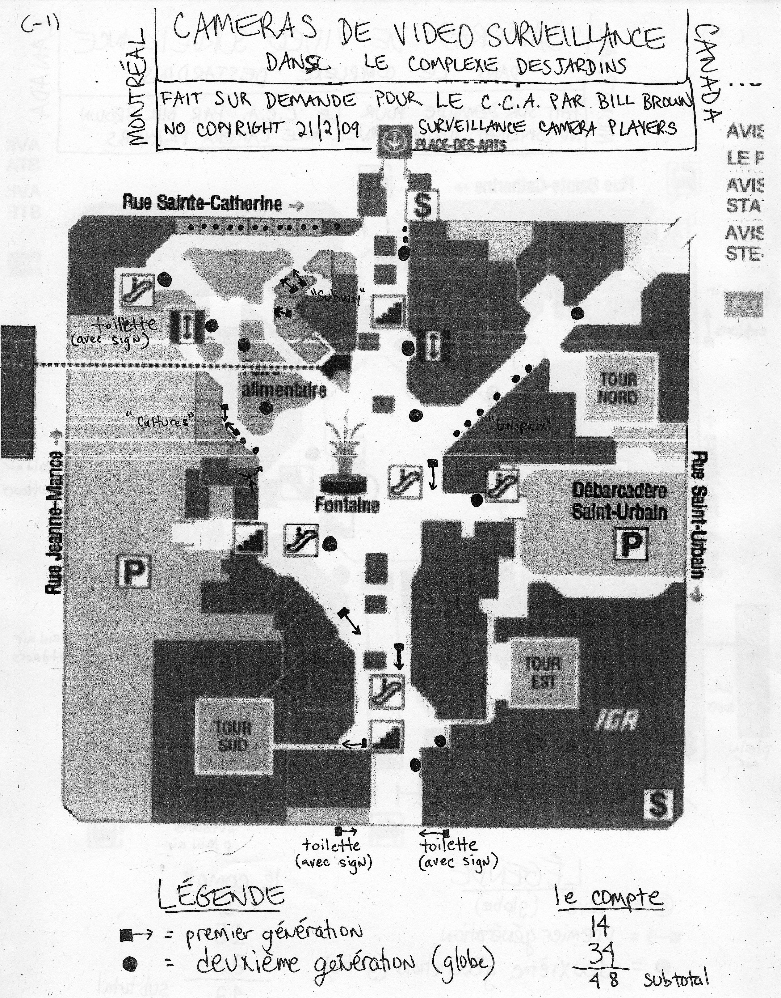 From 19 February to 21 February 2009, Bill Brown of the Surveillance Camera Players (SCP) traveled to Montreal, Canada, to make a map of the surveillance cameras installed in La Ville Souterraine and then give a walking tour based upon it. Sponsored by the Canadian Center for Architecture (CCA), Bill's visit supplemented the SCP's participation in the exhibition entitled Actions: Comment s'approprier la ville, which the CCA curated and hosted between 26 November 2008 and 19 April 2009, and which included more than a dozen such maps Bill has made over the years, as well as a copy of the SCP's classic performance of George Orwell's Nineteen-Eighty-Four. Other participants in the exhibition -- and thus the exhibition catalogue, Actions: What You Can Do With the City (SUN, 2008), which was edited by its curators, Mirko Zardini and Giovanna Borasi -- included an international assortment of guerrilla gardeners, dumpster-divers, radical pedestrians, stencil-writers, urban explorers, parkour traceurs and (closest to the SCP) the Institute for Applied Autonomy's iSee project.