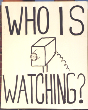 The handwritten phrases are as follows: YOU ARE BEING WATCHED FOR YOUR OWN SAFETY; WHO IS WATCHING?; COPS WITH GUNS ARE WATCHING; WHO WATCHES THE WATCHERS?; COPS WILL SHOOT PICTURES THE WAY COPS SHOOT GUNS; NO MORE RACIAL PROFILING; NO MORE INVASIONS OF PRIVACY.