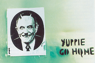 Graffiti has appeared around Bedford Avenue that proclaims YUPPIE GO HOME. While we sympathize with what we assume to be the author's (or authors') motivations for spray-painting this phrase in several locations in our rapidly gentrifying neighborhood, we must say that we don't believe that yuppies can be told to "go home" -- not because it is rude to do so, nor because they are already at home in Williamsburg -- but because Young, Upwardly-mobile Professionals have no home to go back to, no matter where they sleep and store their stuff. To be a yuppie is to be at home nowhere and to be a tourist everywhere.